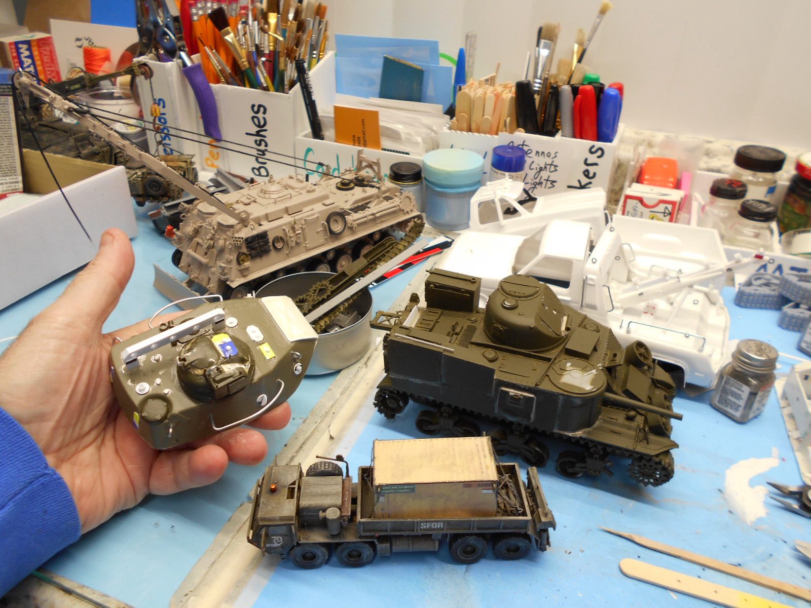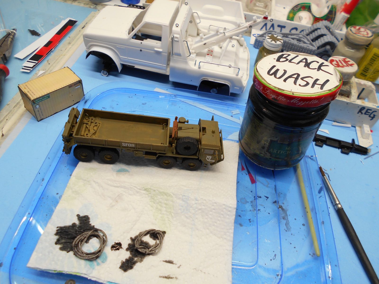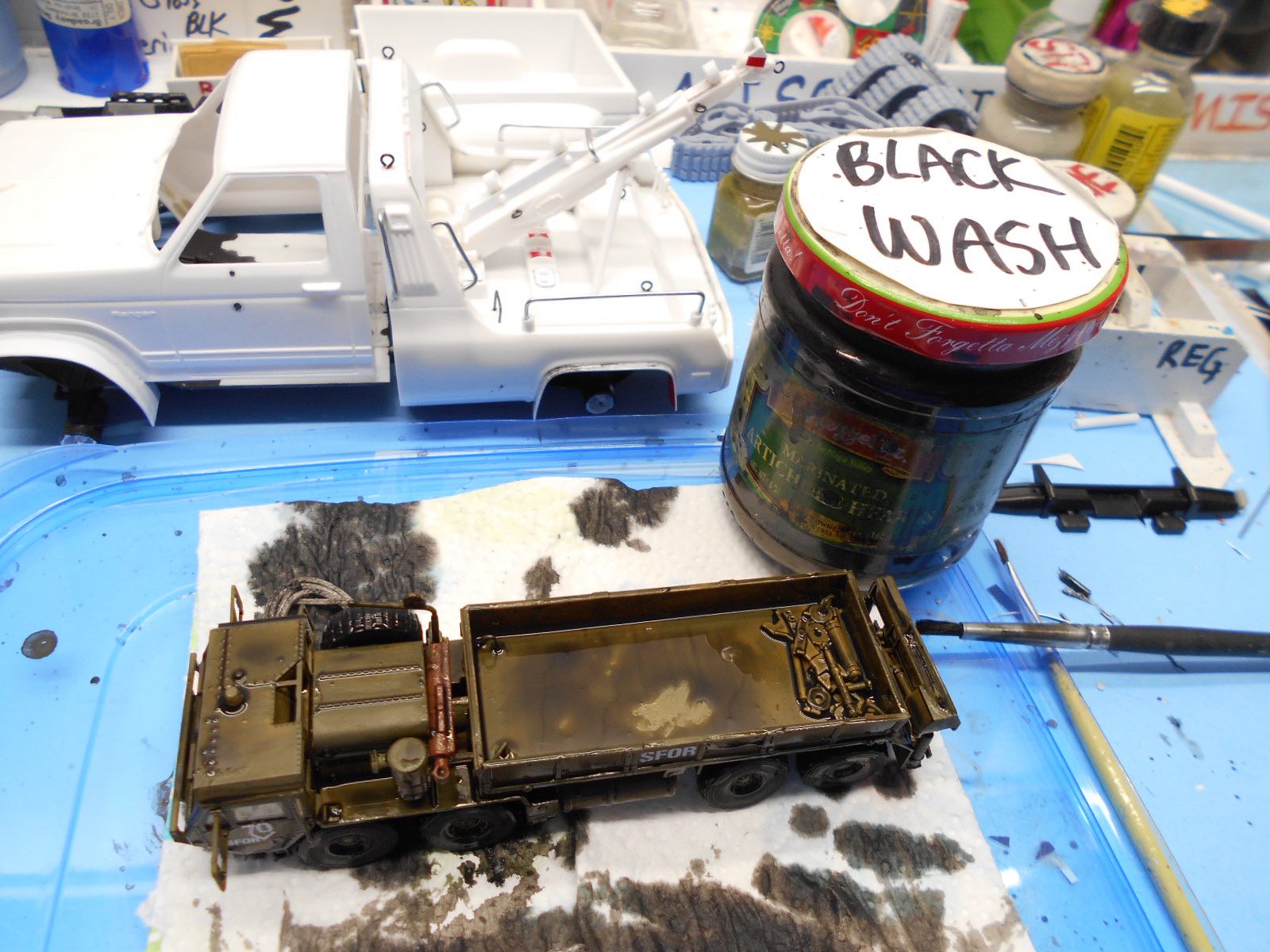 The M-977 truck was ALL glued together about 99%. Hand painted, black tire paint, decals first....now paint my cheap craft paint black wash all over it. No cracks left behind...LOL!!